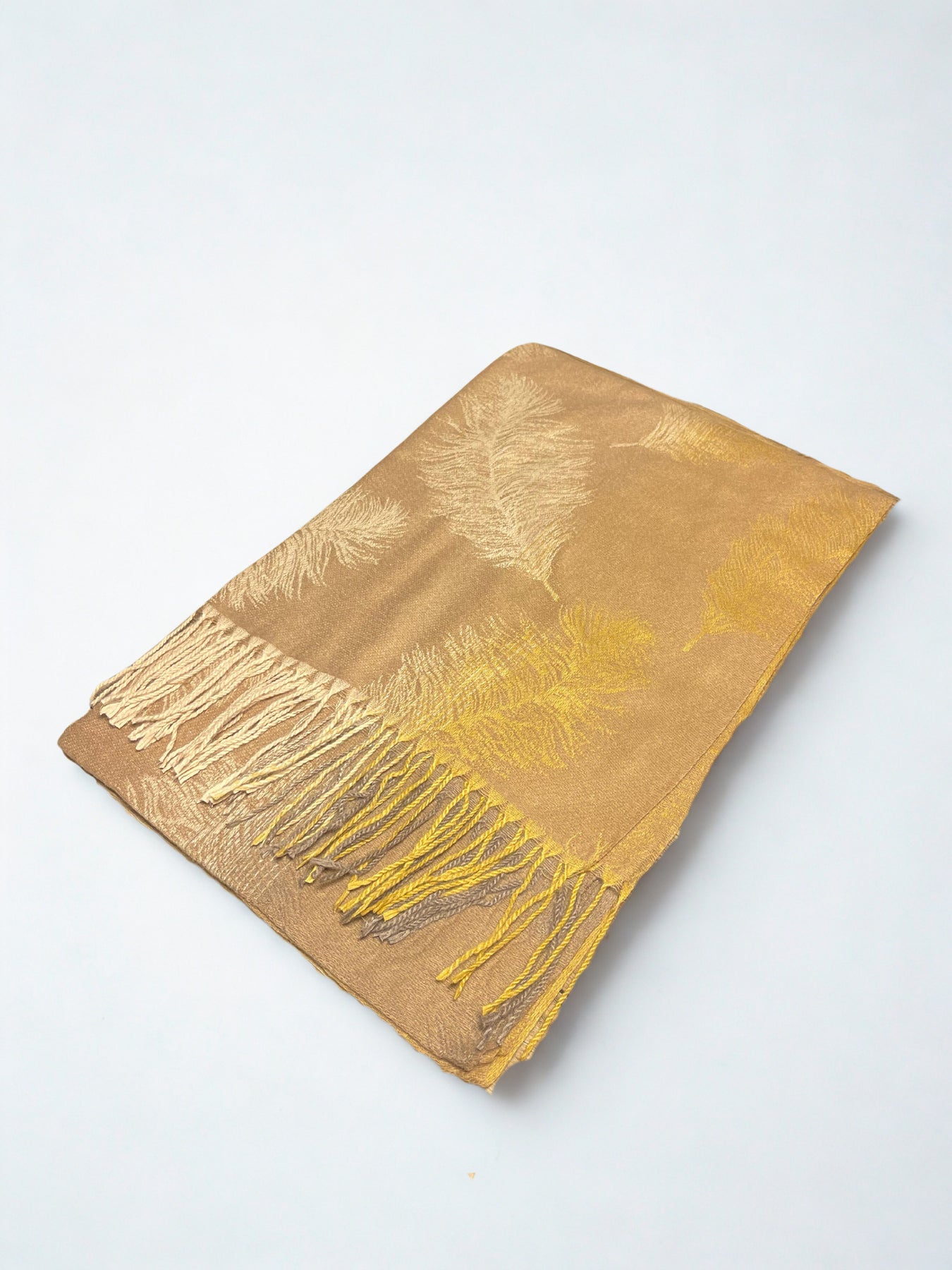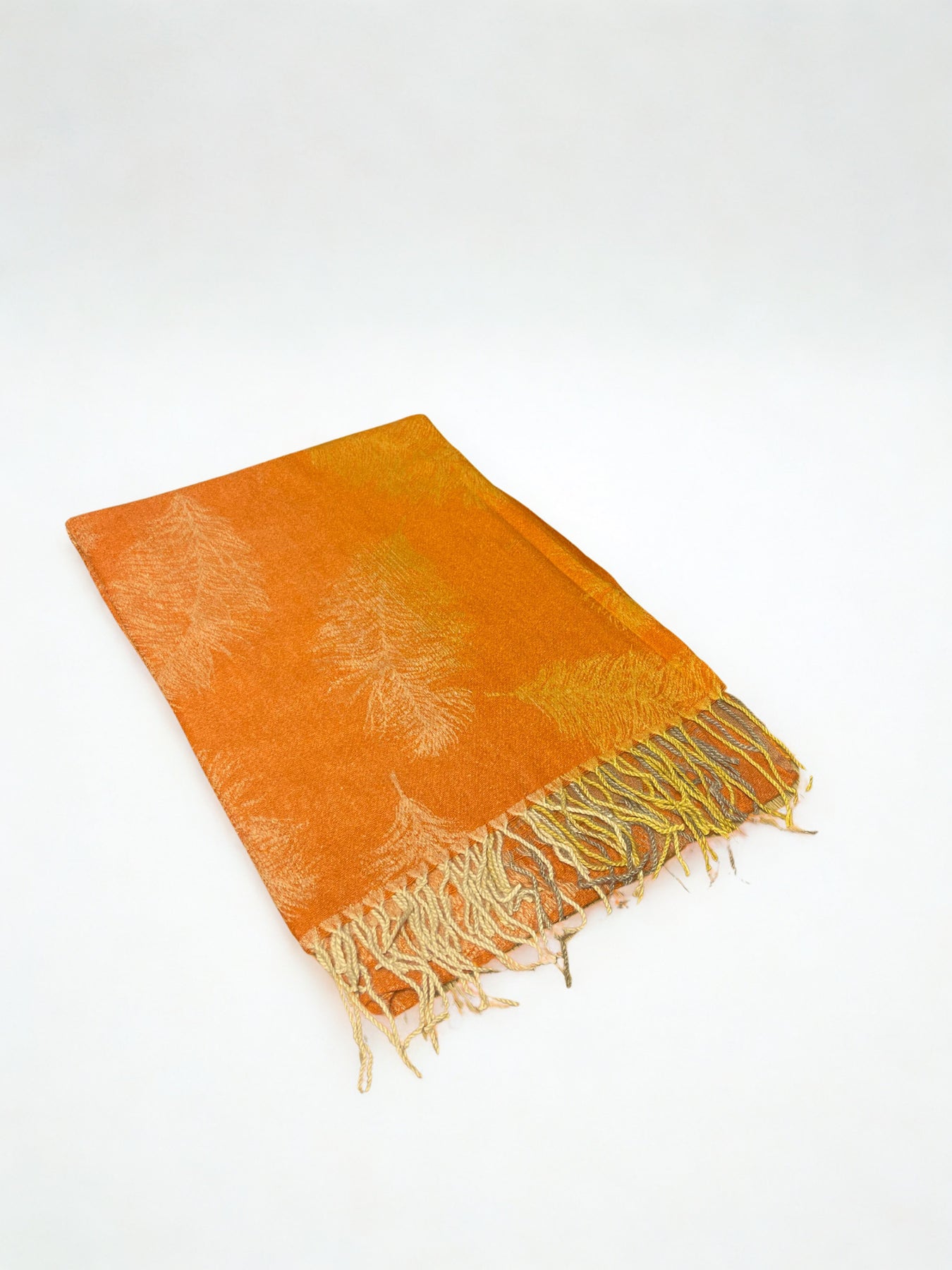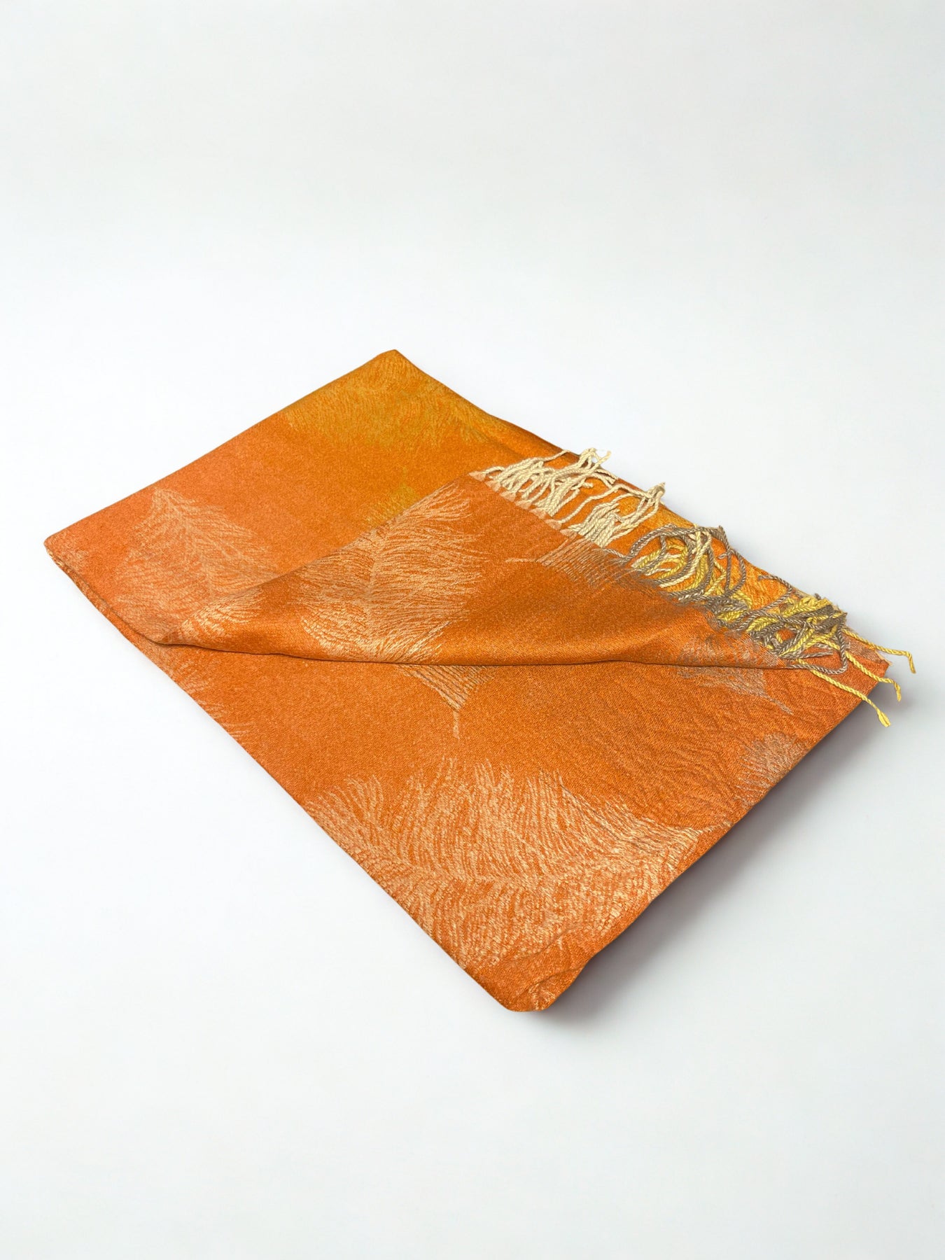 The rich warm orange hue, enhanced with subtle woven leaf design, creates a sophisticated look that transitions seamlessly from day to evening wear. Finished with delicate hand-twisted fringes, this stole is perfect for layering over both traditional and modern outfits.